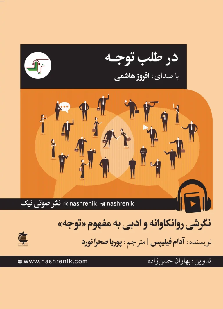 کتاب صوتی در طلب توجه اثر آدام فیلیپس، بررسیای روانشناختی و فلسفی درباره نیاز انسانی به توجه و تأثیرات آن بر روابط، هویت و روان انسانها است. این کتاب بهطور دقیق و با نگاهی انتقادی به چگونگی شکلگیری و اهمیت توجه در زندگی روزمره میپردازد و آن را یکی از نیازهای بنیادین انسانها معرفی میکند.