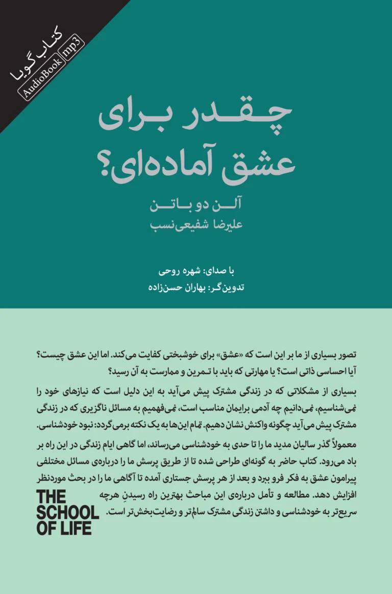 کتاب صوتی «چقدر برای عشق آمادهای؟» نگاهی تازه به عشق، رابطه و انتظاراتی دارد که اغلب بدون آگاهی وارد زندگی ما میشوند. محتوای آن حول این پرسش میچرخد که چرا بسیاری از انسانها وارد رابطه میشوند اما کمتر کسی واقعاً برای مسئولیتهای آن آماده است. دوباتن توضیح میدهد که عشق پایدار نه با هیجان آغاز میشود و نه با خیالپردازی ادامه پیدا میکند؛ بلکه حاصل شناخت خود، شناخت دیگری و مهارتهایی است که باید یاد گرفته شوند.